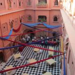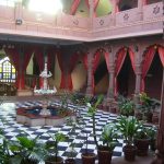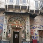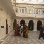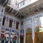 Arriving at Mandawa in the dark, we got the impression of a dusty country town. Suddenly we were sitting in front of a huge, ornate and beautifully maintained “palace”. This was our first hotel (former merchant’s mansion known as a haveli) and in and out it was a thing of beauty restored to its earlier 18th century glory. Mandawa and the next village of Fahtepur were major stops on the silk road or spice route in its heyday, and they contain dozens of these mansions, most with 40 rooms or more with multiple courtyards, some restored but many not. The major feature was the miniature paintings which mingle with the painted filigree of both the interior and exterior of these extraordinary buildings. The frescoes run the full gamut of human experience and on occasion include curiosities of the late 19th century such as trains, hot air balloons and a rendering of Queen Victoria sitting in an early automobile.