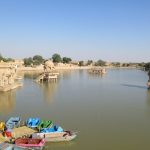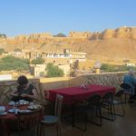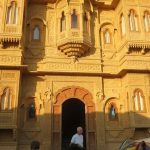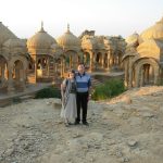 Jaisalmer is as striking with its yellow sandstone buildings as Bikaner was with red. We have really enjoyed the many hours every day spent driving from one stop to the next. There is always something interesting to see, or we read, we look over & organize photos or just nap. Our Toyota van is comfortable, our driver Raj is first rate in spite of the road surfaces, which range from smooth to miniature Himalayas. On arrival in Jaisalmer, we spent some time trying to find a working ATM. After discovering 7 consecutive non-working ATMs (since arrival in India), my frustration was finally eased by the discovery of one which actually did work. After checking into our heritage hotel (a beautiful yellow stone restoration), we drove into the country to a royal cemetery with striking cenotaph structures from the 15th century to watch the desert sunset. The day was brought to a conclusion of perfection with a dinner at “Trio”, which sits outdoors atop an ancient palace wall. It was a great view, superb dinner and evening with Ralph and Caroline. Returning to the hotel room, we immersed ourselves in the world of internet communication, writing and receiving messages and posing merciless interrogations of Mr. Google from whom all wisdom flows. A sound sleep was encouraged by the room decor, which with its vibrant, silky, filmy appointments, looked very much like a zenana (harem).