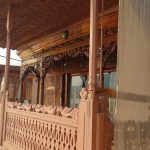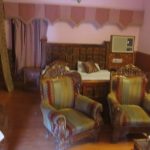 Paddling across the lake took about 10 minutes and we arrived at our houseboat, a huge affair (more than 100 feet long and 20 feet wide with living room dining room and 3 en-suite bedrooms). We were greeted by 2 servants in uniform, although this seemed to be for show, since we only saw one of them after that. Sitting on cushioned seats on the front porch and drinking Kashmiri tea, we reveled in the beauty and serenity of the lake before being shown to our bedrooms which, like the living and dining rooms are are lavishly appointed with heavy, ornate, plush walnut furniture from a grander era. As you can see from the photos, the rugs, curtains and just about all of the wood are decorated – the wood in particular in great detail of geometric designs, which are apparently hand-carved. We stayed in an older houseboat for the first night, moving to a more elaborate one for the next two nights.
