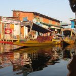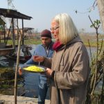 Our second day in Kashmir, included visits to three formal gardens with fountains and various vistas, trying the deep fried lotus root in the market and lunching in the old city – where our guide the multifaceted, multitalented and multitasking Bashir (Cook, Valet, Driver etc.) showed us how to eat Indian Fashion with our right hands. I quite enjoyed the experience, but hey, Canadians are no strangers to eating with our hands: burritos, fried chicken, beer…. My only problem was that the turmeric stained my moustache for the rest of the day, rendering me a more visible than usual minority. Just before lunch we visited the Hazratbal Mosque, where Connie and Caroline got to cover themselves and experience the prayer mat, while Ralph and I got to stay outside with the rest of the infidels. Next, we saw the immense Jamia Masjid (mosque) which can host 33,000 worshippers, followed by the also wooden Dastgir Sahib Mosque, with its facade of painted paper mache, astoundingly still in excellent condition. The grand finale was an exhausting walk up almost 500 steps to the top of a mountain overlooking Dal Lake to see the Shankaracharya Hindu Temple. It wasn’t much to see when you got there, but we were rewarded with the superb view and also the knowledge that four old farts can climb that high and live to tell their grandchildren about the experience. Our last day was taken up with shopping at the floating markets. Ralph & Caroline face a third mortgage on their house in order to buy two beautiful silk Kashmiri hand stitched rugs, with a pashmina scarf thrown in. Connie and I had a go at some traditional paper maché artwork and still had change left over. The experience in this magic place was dominated by the water-based lives of this community. One goes nowhere without a boat – to shops, to school, to the mainland, to clinics and to other houseboats. The visual effect of all this is stunning with all the colour of the dwellings and the sikaras, set amid the lake, its canals, its lotus patches, lily pads, floating gardens and of course the surrounding majestic mountains.